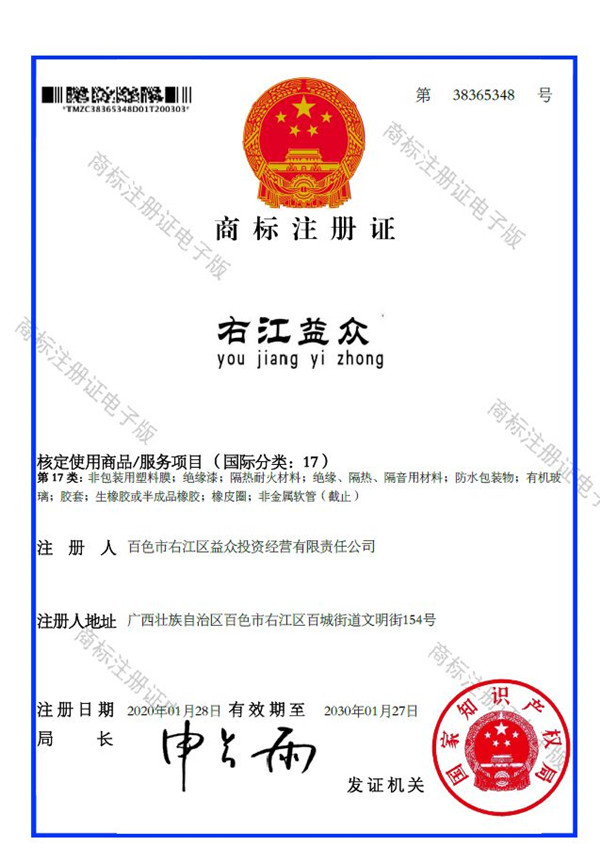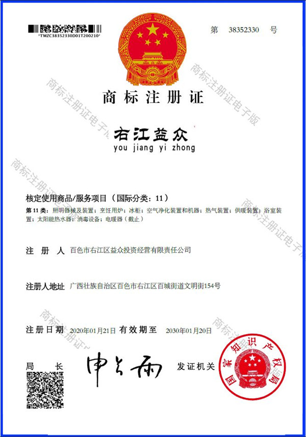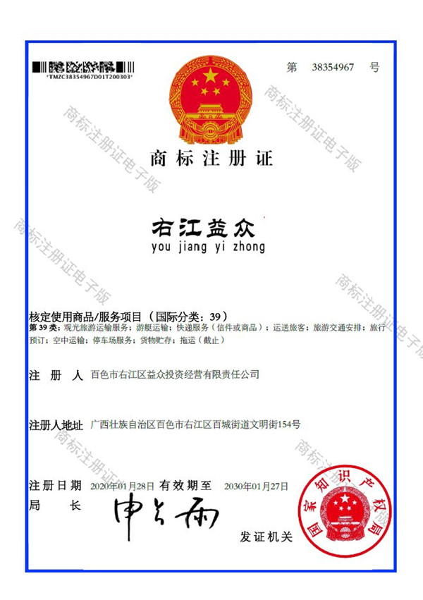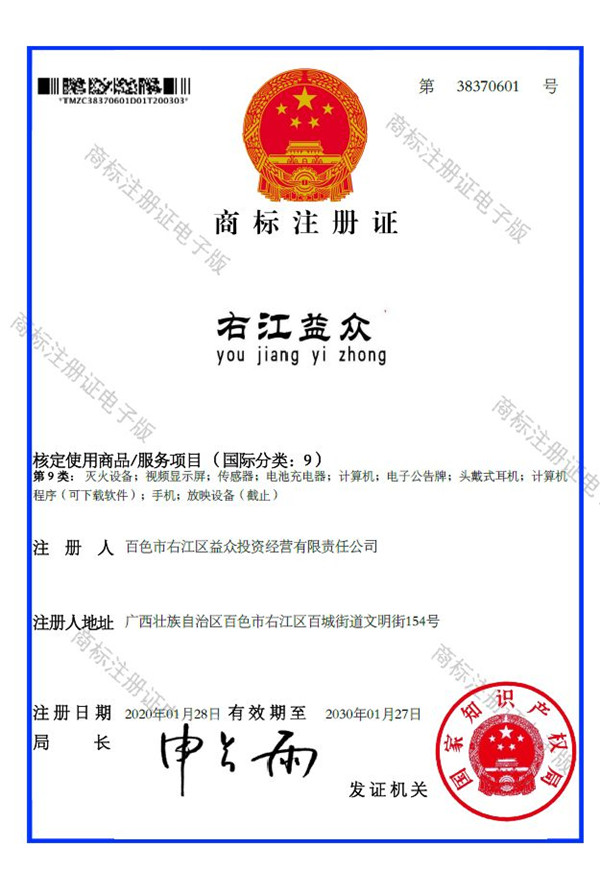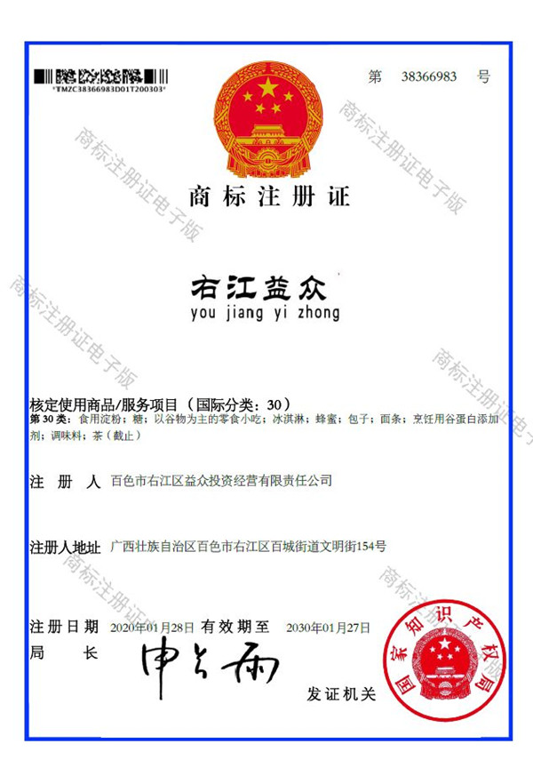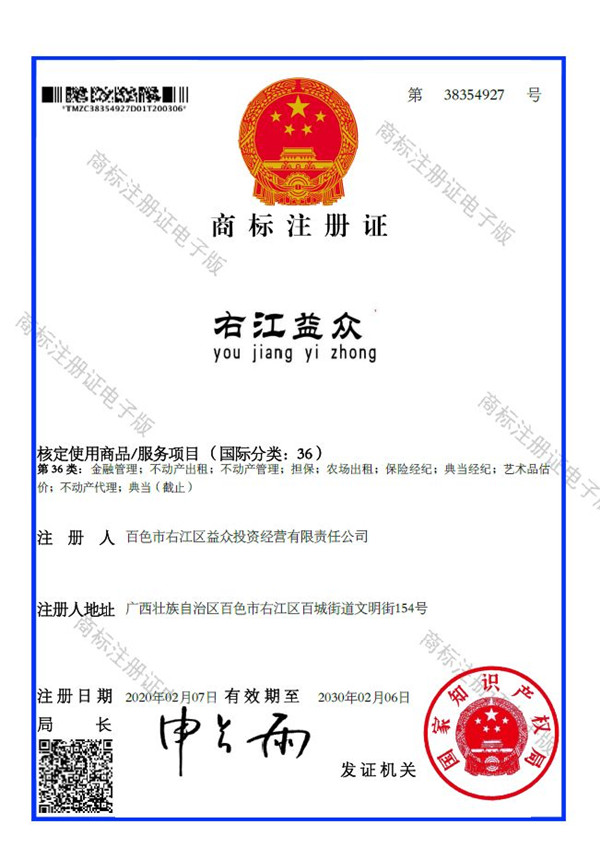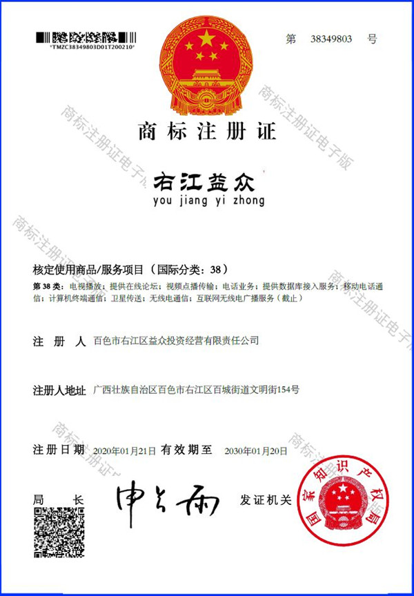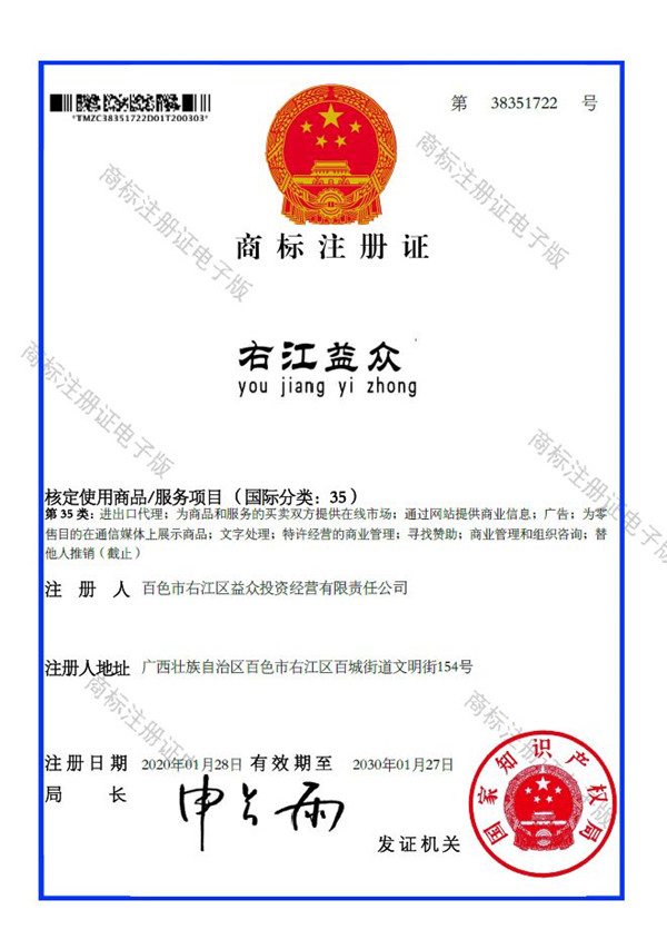 2019年4月,為樹立企業(yè)品牌形象,充分展現(xiàn)品牌價(jià)值,廣西百色益眾投資有限公司按照建設(shè)現(xiàn)代企業(yè)的方向和標(biāo)準(zhǔn),啟動(dòng)品牌商標(biāo)注冊申報(bào)工作,經(jīng)過6個(gè)月的審核期和3個(gè)月的公告期,“右江益眾”45個(gè)大類商標(biāo)品牌第一時(shí)間成功獲批。“右江益眾”品牌的成功注冊,有利于公司更好地參與市場競爭,同時(shí),對于強(qiáng)化企業(yè)內(nèi)部管理、樹立良好的企業(yè)形象、提升公司美譽(yù)度也可起到積極的助推作用。