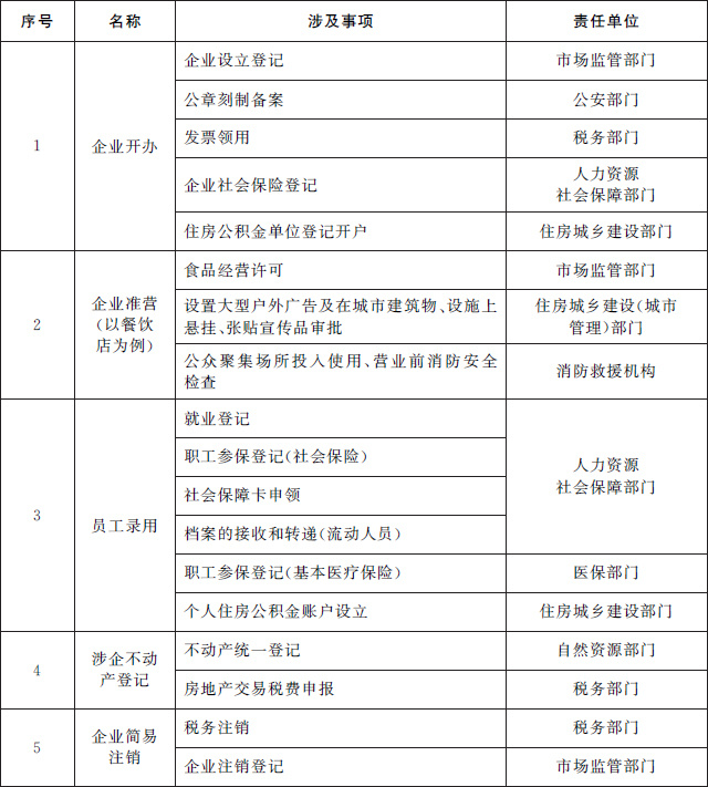 (一)推進(jìn)企業(yè)全生命周期相關(guān)政務(wù)服務(wù)事項(xiàng)“一件事一次辦”。圍繞企業(yè)從開辦到注銷全生命周期的重要階段,梳理集成同一階段內(nèi)需要到政府部門、公用企事業(yè)單位和服務(wù)機(jī)構(gòu)辦理的多個(gè)單一政務(wù)服務(wù)事項(xiàng),為企業(yè)提供開辦、工程建設(shè)、生產(chǎn)經(jīng)營(yíng)、惠企政策兌現(xiàn)、員工錄用、不動(dòng)產(chǎn)登記、注銷等集成化辦理服務(wù),提高辦事效率,降低辦事成本。