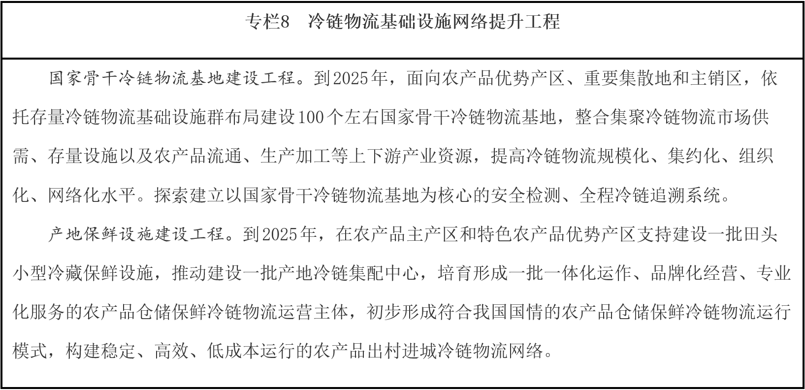 提高冷鏈物流質(zhì)量效率。大力發(fā)展鐵路冷鏈運輸和集裝箱公鐵水聯(lián)運,對接主要農(nóng)產(chǎn)品產(chǎn)區(qū)和集散地,創(chuàng)新冷鏈物流干支銜接模式。發(fā)展“生鮮電商+產(chǎn)地直發(fā)”等冷鏈物流新業(yè)態(tài)新模式。推廣蓄冷箱、保溫箱等單元化冷鏈載器具和標準化冷藏車,促進冷鏈物流信息互聯(lián)互通,提高冷鏈物流規(guī)模化、標準化水平。依托國家骨干冷鏈物流基地、產(chǎn)銷冷鏈集配中心等大型冷鏈物流設(shè)施,加強生鮮農(nóng)產(chǎn)品檢驗檢疫、農(nóng)獸藥殘留及防腐劑、保鮮劑、添加劑合規(guī)使用等質(zhì)量監(jiān)管。研究推廣應(yīng)用冷鏈道路運輸電子運單,加強產(chǎn)品溯源和全程溫濕度監(jiān)控,將源頭至終端的冷鏈物流全鏈條納入監(jiān)管范圍,提升冷鏈物流質(zhì)量保障水平。健全進口冷鏈食品檢驗檢疫制度,筑牢疫情外防輸入防線。