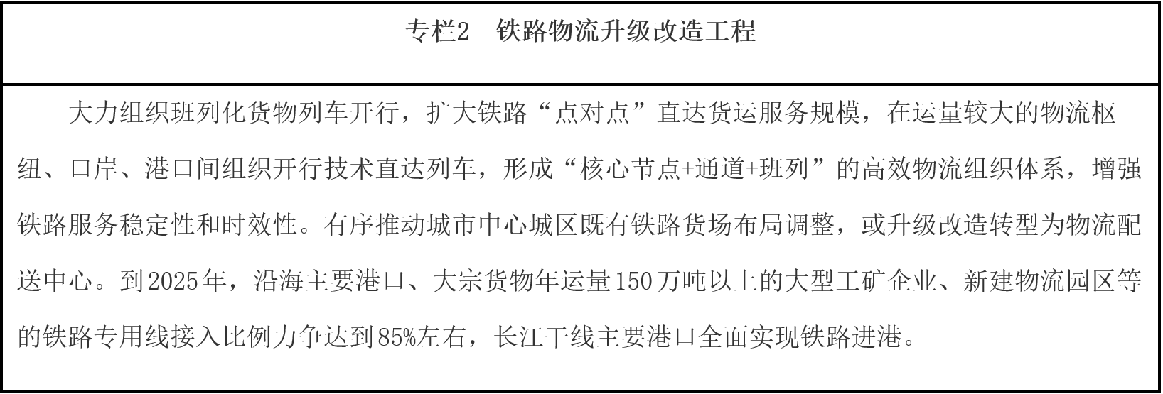 推進結(jié)構(gòu)性降成本。加快推進鐵路專用線進港區(qū)、連園區(qū)、接廠區(qū),合理有序推進大宗商品等中長距離運輸“公轉(zhuǎn)鐵”、“公轉(zhuǎn)水”。完善集裝箱公鐵聯(lián)運銜接設(shè)施,鼓勵發(fā)展集拼集運、模塊化運輸、“散改集”等組織模式,發(fā)揮鐵路干線運輸成本低和公路網(wǎng)絡(luò)靈活優(yōu)勢,培育有競爭力的“門到門”公鐵聯(lián)運服務(wù)模式,降低公鐵聯(lián)運全程物流成本。統(tǒng)籌沿海港口綜合利用,提升大型港口基礎(chǔ)設(shè)施服務(wù)能力,提高碼頭現(xiàn)代化專業(yè)化規(guī)模化水平,加快推進鐵水聯(lián)運銜接場站改造,提高港口鐵路專用線集疏網(wǎng)絡(luò)效能,優(yōu)化作業(yè)流程。完善內(nèi)河水運網(wǎng)絡(luò),統(tǒng)籌江海直達、江海聯(lián)運發(fā)展,發(fā)揮近海航線、長江水道、珠江水道等水運效能,穩(wěn)步推進貨物運輸“公轉(zhuǎn)水”。推進鐵水聯(lián)運業(yè)務(wù)單證電子化,促進鐵路、港口信息互聯(lián),實現(xiàn)鐵路現(xiàn)車、裝卸車、貨物在途、到達預(yù)確報以及港口裝卸、貨物堆存、船舶進出港、船期艙位預(yù)定等鐵水聯(lián)運信息交換共享。支持港口、鐵路場站加快完善集疏運油氣管網(wǎng),有效對接石化等產(chǎn)業(yè)布局,提高管道運輸比例。