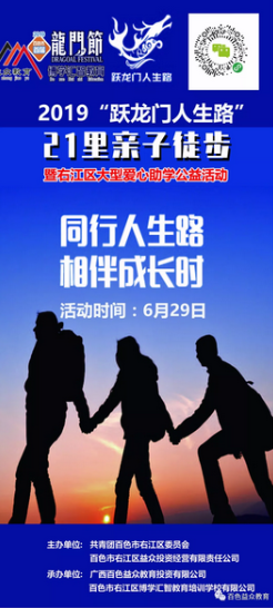2019年百色市首屆龍門節(jié)暨右江區(qū)大型愛心助學(xué)公益活動(dòng)第三場—“躍龍門人生路”親子徒步活動(dòng)將于6月29日舉行,徒步全程10.5公里。活動(dòng)目的是為了更好地傳播“家庭+傳承+親子”的價(jià)值理念,以徒步的形式延伸出孩子成長路上的每個(gè)階段,徒步的背后蘊(yùn)含著一個(gè)永不言棄的家庭奮斗精神。活動(dòng)報(bào)名費(fèi)用50元/家庭(含2家長+1孩子或者1家長+2孩子),所有報(bào)名費(fèi)用由共青團(tuán)百色市右江區(qū)委員會(huì)捐贈(zèng)給右江區(qū)建檔立卡的貧困家庭學(xué)生。報(bào)名參與長按海報(bào)上二維碼識別繳費(fèi)即可,歡迎廣大學(xué)生家長踴躍參與。