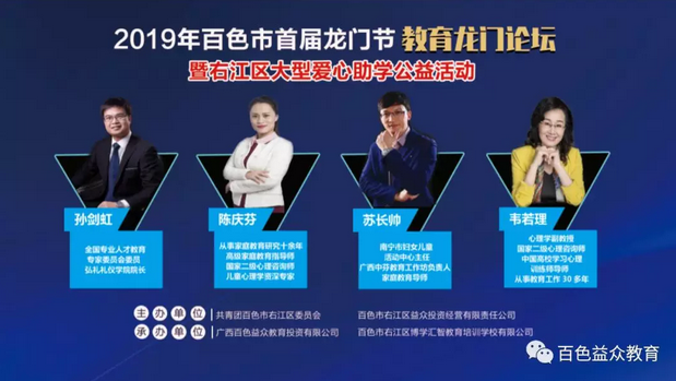 為了給百色的家長和孩子們奉獻(xiàn)一場空前的教育盛宴,論壇邀請到中國商業(yè)禮儀研究院執(zhí)行院長孫劍虹,廣西金珊瑚教育集團(tuán)董事長陳慶芬,南寧市婦女兒童活動(dòng)中心主任蘇長帥,中國心理健康教育研究院專家韋若理。4位教育名家齊聚一堂,為百色的家長和孩子們帶來了關(guān)于家風(fēng)建設(shè)、家庭教育、芬蘭先進(jìn)兒童教育理念、兒童專注力培養(yǎng)領(lǐng)域的深刻研究見解,贏得了到場家長的肯定和掌聲。