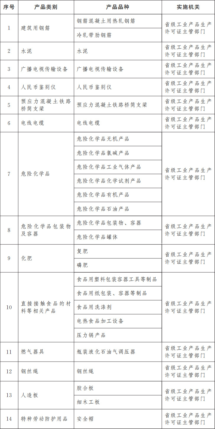 為保障重要工業(yè)產(chǎn)品質(zhì)量安全,強化產(chǎn)品準(zhǔn)入管理和源頭治理,防范產(chǎn)品質(zhì)量安全重大風(fēng)險,確保人民群眾生命財產(chǎn)安全和公共安全,國務(wù)院決定,調(diào)整完善工業(yè)產(chǎn)品生產(chǎn)許可證管理目錄,對冷軋帶肋鋼筋、瓶裝液化石油氣調(diào)壓器、鋼絲繩、膠合板、細(xì)木工板、安全帽等6種產(chǎn)品實施工業(yè)產(chǎn)品生產(chǎn)許可證管理。調(diào)整后,實施工業(yè)產(chǎn)品生產(chǎn)許可證管理的產(chǎn)品共計14類27個品種,由省級工業(yè)產(chǎn)品生產(chǎn)許可證主管部門負(fù)責(zé)實施,相關(guān)審批權(quán)限不得下放。同時,化肥生產(chǎn)許可證審批方式由告知承諾調(diào)整為“先核后證”審批。