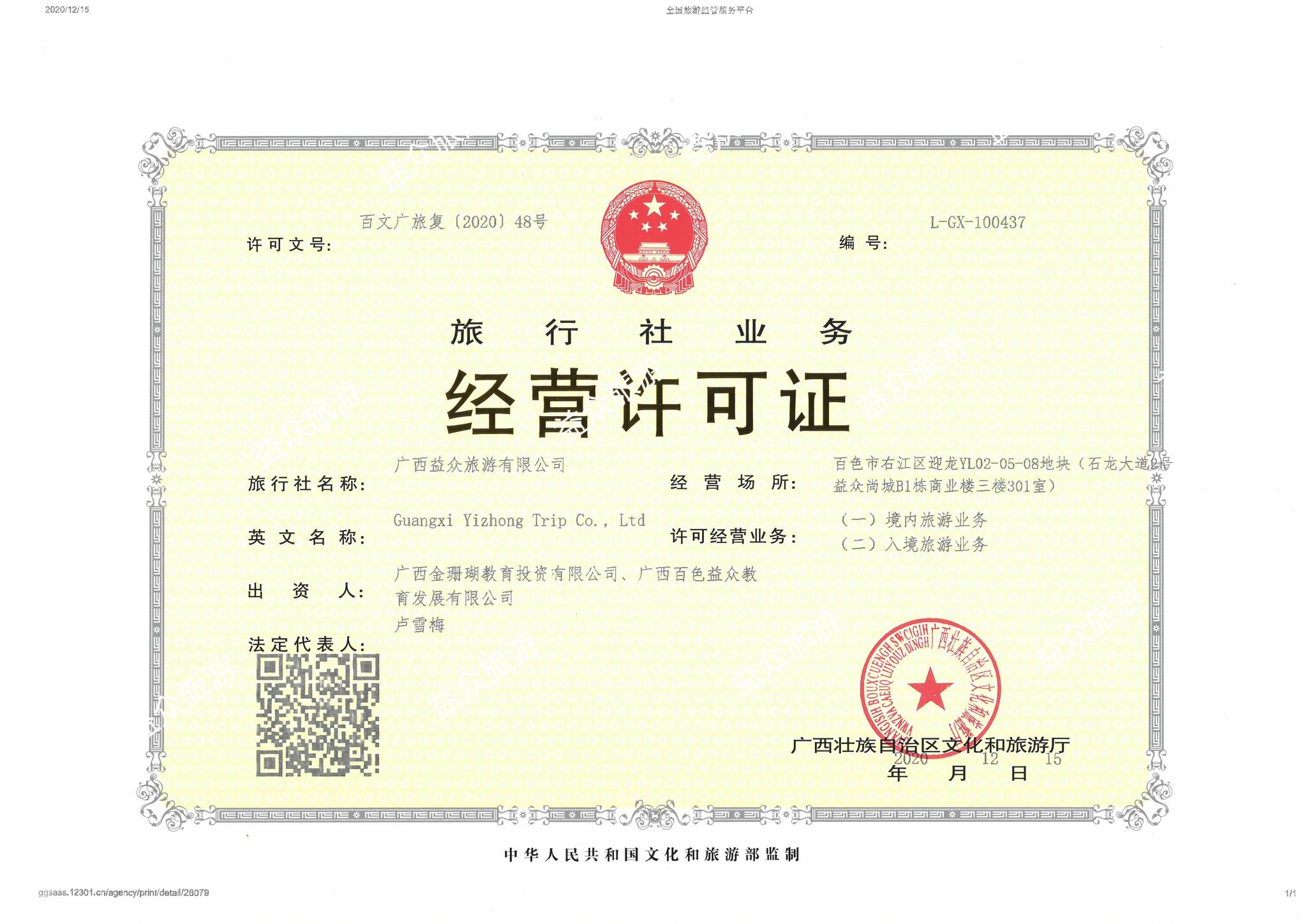 ????????12月15日,廣西益眾旅游有限公司通過廣西壯族自治區(qū)文化和旅游廳各項(xiàng)認(rèn)證,符合國(guó)家各項(xiàng)標(biāo)準(zhǔn)要求,獲得了旅行社業(yè)務(wù)經(jīng)營(yíng)許可證。