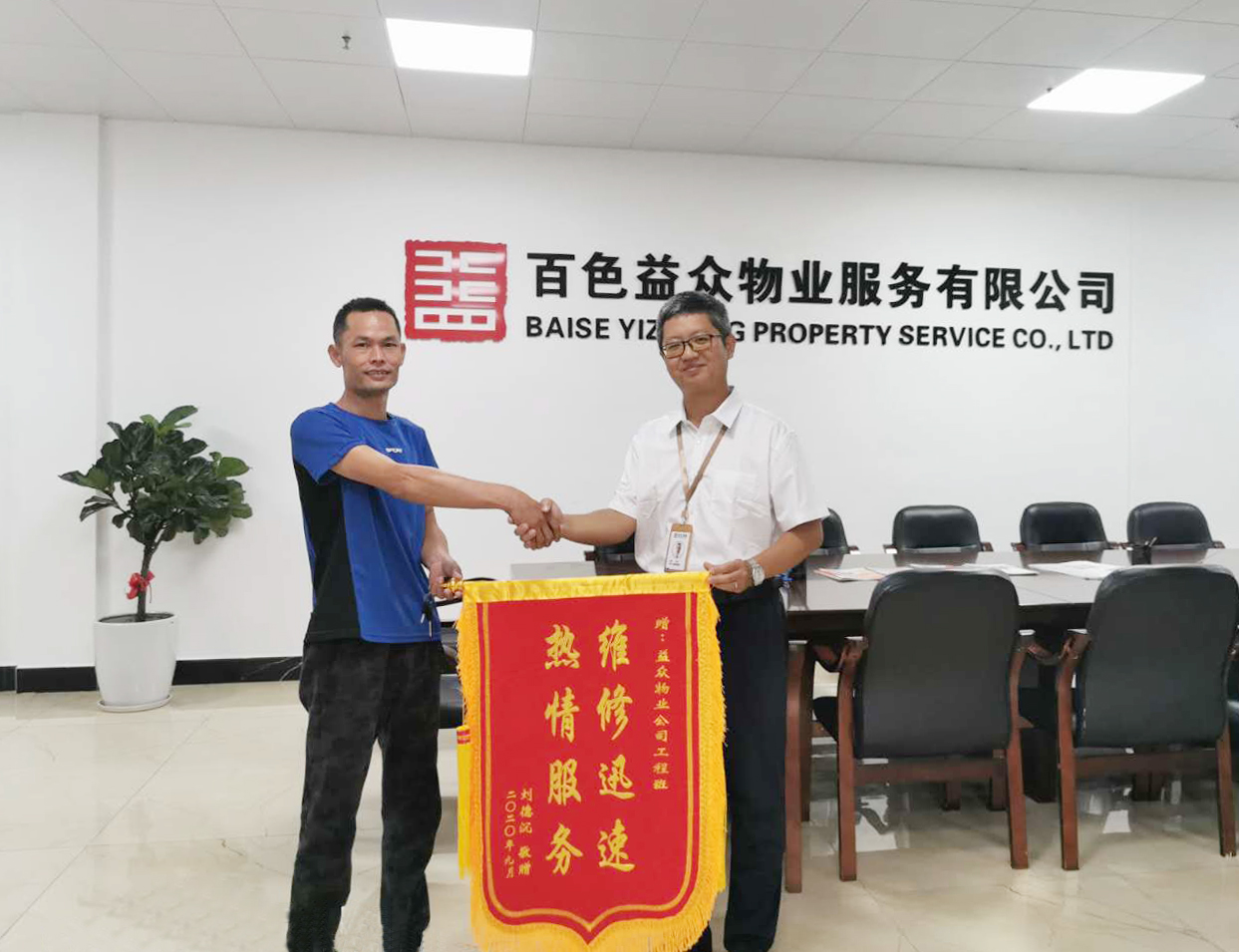????????近日,右江區(qū)“老鄉(xiāng)家園-迎龍易地扶貧搬遷安置小鎮(zhèn)”4棟101商鋪的黃先生將一面“熱情服務(wù) 維修迅速”的錦旗送到益眾物業(yè)服務(wù)中心。