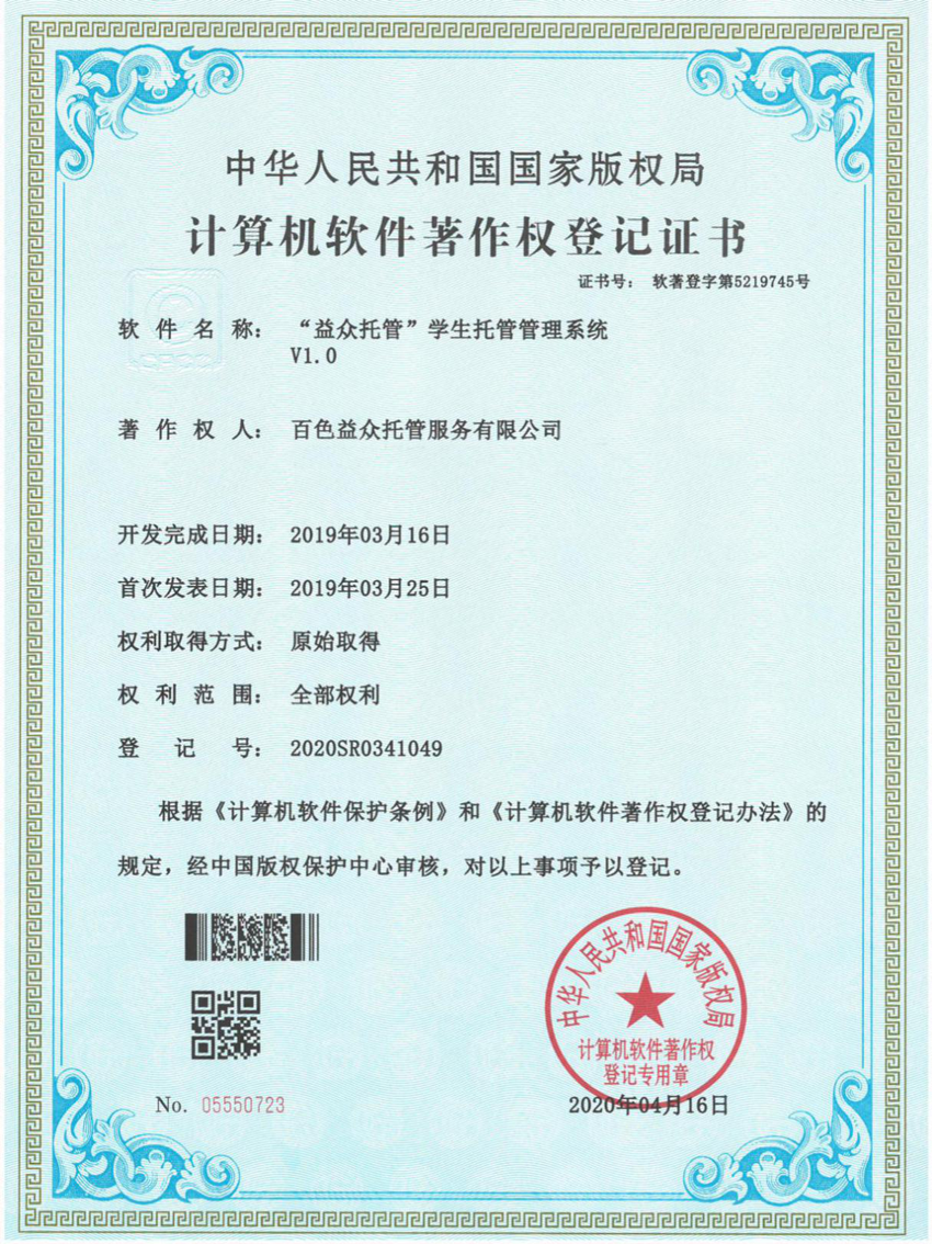 日前,經(jīng)中國(guó)版權(quán)保護(hù)中心審核,百色益眾托管服務(wù)有限公司提交的《“益眾托管”學(xué)生托管管理系統(tǒng)》符合《計(jì)算機(jī)軟件保護(hù)條例》和《計(jì)算機(jī)軟件著作權(quán)登記辦法》的相關(guān)規(guī)定,被認(rèn)定為原始取得,獲得國(guó)家版權(quán)局頒發(fā)《計(jì)算機(jī)軟件著作權(quán)登記證書(shū)》。