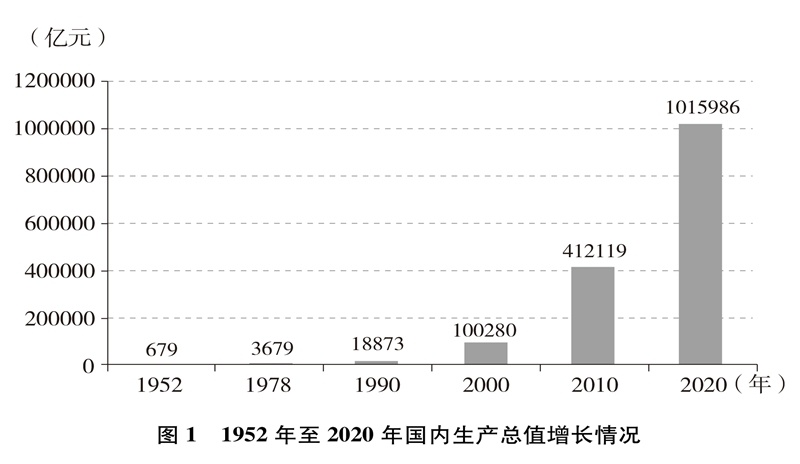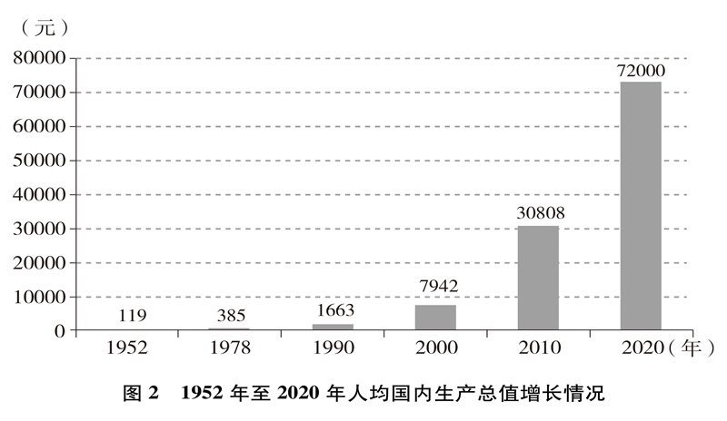經(jīng)濟(jì)實(shí)力大幅提升。中國國內(nèi)生產(chǎn)總值從1952年的679.1億元躍升至2020年的101.6萬億元,經(jīng)濟(jì)總量占全球經(jīng)濟(jì)比重超過17%,穩(wěn)居世界第二大經(jīng)濟(jì)體(圖1)。人均國內(nèi)生產(chǎn)總值從1952年的幾十美元增至2020年的超過1萬美元,實(shí)現(xiàn)從低收入國家到中等偏上收入國家的歷史性跨越(圖2)。制造業(yè)增加值多年位居世界首位,220多種工業(yè)產(chǎn)品產(chǎn)量居世界第一,自2010年起連續(xù)11年位居世界第一制造業(yè)大國。中國已是全球貨物貿(mào)易第一大國、服務(wù)貿(mào)易第二大國、商品消費(fèi)第二大國、外匯儲備第一大國,2020年利用外資居全球第一。不斷邁向共同富裕的14億多人口,其中有超過4億并不斷擴(kuò)大的中等收入群體,是全球最具成長性的超大規(guī)模市場,中國經(jīng)濟(jì)充滿活力,具有巨大潛力和充足后勁。2020年,中國率先控制新冠肺炎疫情,率先復(fù)工復(fù)產(chǎn),率先實(shí)現(xiàn)經(jīng)濟(jì)增長由負(fù)轉(zhuǎn)正,充分彰顯中國經(jīng)濟(jì)的強(qiáng)勁韌性。