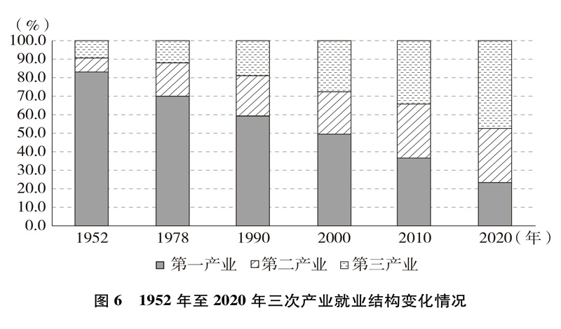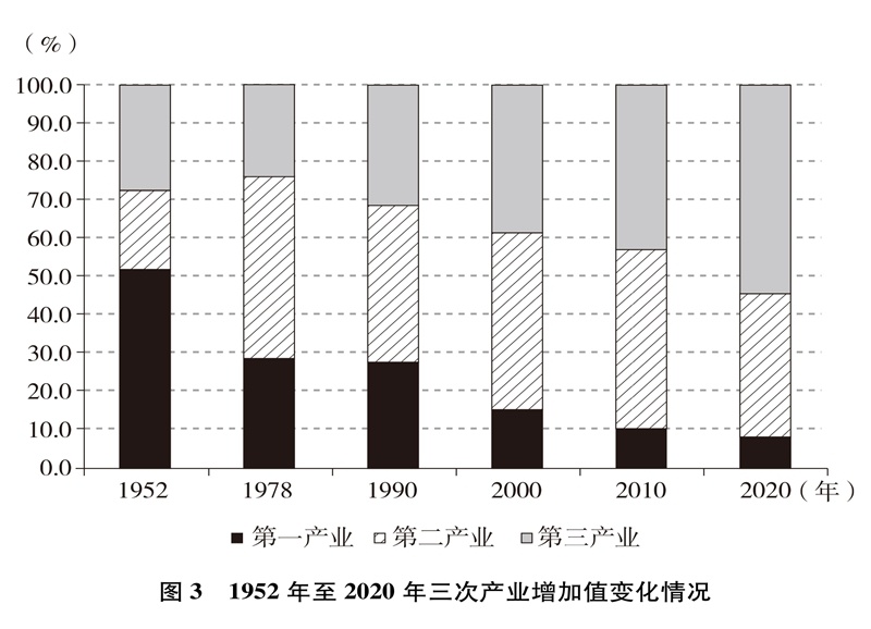 產(chǎn)業(yè)結(jié)構(gòu)優(yōu)化升級。中國已建成世界上最完整的產(chǎn)業(yè)體系,產(chǎn)業(yè)發(fā)展持續(xù)向中高端邁進(jìn)。三次產(chǎn)業(yè)增加值之比從1952年的50.5∶20.8∶28.7到2020年的7.7∶37.8∶54.5,中國從傳統(tǒng)農(nóng)業(yè)大國成為工業(yè)大國、服務(wù)業(yè)大國(圖3),中國經(jīng)濟(jì)從依賴單一產(chǎn)業(yè)為主轉(zhuǎn)向依靠三次產(chǎn)業(yè)共同帶動。農(nóng)業(yè)現(xiàn)代化成效顯著,機(jī)械化、數(shù)字化、綠色化、功能化、共享化水平明顯提高,廣大農(nóng)民逐步告別“面朝黃土背朝天、一身力氣百身汗”的辛勞,農(nóng)村生產(chǎn)力極大解放;糧食生產(chǎn)能力穩(wěn)步提升,實(shí)現(xiàn)谷物基本自給,中國人把飯碗牢牢端在自己手中。中國建成門類齊全、獨(dú)立完整的現(xiàn)代工業(yè)體系,工業(yè)化和信息化融合發(fā)展的廣度和深度不斷拓展,“中國制造”向“中國智造”轉(zhuǎn)型升級,產(chǎn)業(yè)鏈供應(yīng)鏈現(xiàn)代化水平進(jìn)一步提升。以新一代信息技術(shù)、生物技術(shù)、高端裝備、綠色環(huán)保為代表的戰(zhàn)略性新興產(chǎn)業(yè)發(fā)展迅速,成為引領(lǐng)高質(zhì)量發(fā)展的重要引擎。數(shù)字經(jīng)濟(jì)激發(fā)經(jīng)濟(jì)發(fā)展新活力,產(chǎn)業(yè)數(shù)字化和數(shù)字產(chǎn)業(yè)化趨勢加快。現(xiàn)代服務(wù)業(yè)加速發(fā)展,以“互聯(lián)網(wǎng)+”為標(biāo)志的新業(yè)態(tài)、新模式層出不窮,平臺經(jīng)濟(jì)、共享經(jīng)濟(jì)蓬勃興起,生產(chǎn)性服務(wù)業(yè)向?qū)I(yè)化和高端化發(fā)展,生活性服務(wù)業(yè)向精細(xì)化和高品質(zhì)轉(zhuǎn)變。產(chǎn)業(yè)結(jié)構(gòu)的優(yōu)化升級促進(jìn)了經(jīng)濟(jì)更加均衡、更加充分的發(fā)展,人們個(gè)性化品質(zhì)化多樣化需求不斷得到滿足。