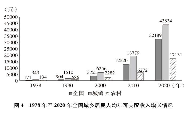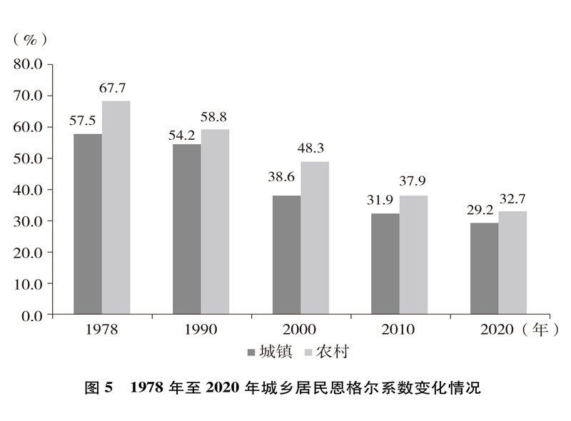 人民生活水平顯著提高。居民收入持續(xù)增加,全國居民人均年可支配收入從1978年的171元增加到2020年的32189元(圖4)。城鄉(xiāng)居民恩格爾系數(shù)分別從1978年的57.5%、67.7%下降到2020年的29.2%、32.7%(圖5),城鄉(xiāng)居民生活質(zhì)量不斷提升。溫飽問題解決后,人們對生活品質(zhì)、品位有了更高的追求,衣食住行不斷升級,消費(fèi)結(jié)構(gòu)從生存型逐漸向發(fā)展型、享受型過渡。衣,從穿暖到穿美、穿出時(shí)尚;食,從吃飽到吃好、吃出健康;住,從有所居到更敞亮、更宜居;行,從便利通暢到快捷舒適。吃穿用有余,家電全面普及,乘用汽車快速進(jìn)入尋常百姓家。餐飲、健康、教育、旅游、文娛等服務(wù)性消費(fèi)持續(xù)快速增長,在居民人均消費(fèi)支出中占比逐漸達(dá)到一半左右。越來越多的人有“錢”有“閑”,“詩和遠(yuǎn)方”更加觸手可及,“說走就走”不再是夢想,旅游扮靚人們的幸福生活,中國正在進(jìn)入大眾旅游時(shí)代。
