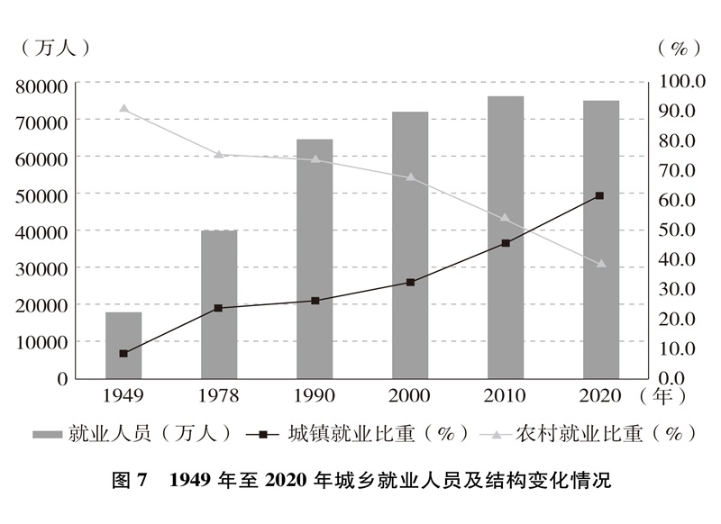就業(yè)局勢長期穩(wěn)定,就業(yè)質(zhì)量顯著提升。就業(yè)人數(shù)從1949年的1.8億增加到2020年的7.5億,就業(yè)規(guī)模不斷擴(kuò)大;從絕大多數(shù)勞動者以農(nóng)業(yè)為生到第三產(chǎn)業(yè)就業(yè)人數(shù)占47.7%(圖6)、城鎮(zhèn)就業(yè)人數(shù)占61.6%(圖7),就業(yè)結(jié)構(gòu)不斷優(yōu)化;從勞動者普遍處于文盲半文盲狀態(tài)到勞動年齡人口平均受教育年限10.8年、技能人才總量約2億,就業(yè)人員素質(zhì)大幅提高。億萬勞動者擁有自己熱愛的工作,開啟幸福生活的大門。從計(jì)劃分配到市場就業(yè)、自由擇業(yè)、自主創(chuàng)業(yè),從傳統(tǒng)就業(yè)方式到新就業(yè)形態(tài),勞動者的就業(yè)觀念深刻變革、就業(yè)空間更加廣闊、就業(yè)方式日益多元。人們的興趣愛好、特長稟賦與個(gè)人就業(yè)意愿、社會需求、國家需要更好結(jié)合,自我價(jià)值更好實(shí)現(xiàn),主動性創(chuàng)造性顯著增強(qiáng),創(chuàng)新創(chuàng)造熱情不斷迸發(fā)。勞動者合法權(quán)益得到保障,勞動報(bào)酬保持增長,勞動所得受到保護(hù),人們越來越有尊嚴(yán)地勞動、快樂地勞動,依靠自己的雙手創(chuàng)造美好生活。從“單休制”到“雙休制”,從“黃金周”到帶薪年休假,勞動者休息休假權(quán)益越來越有保障,工作生活更加平衡。勞動最光榮、最崇高、最偉大、最美麗日益成為全社會的共識和行動,勤奮做事、勤勉為人、勤勞致富成為風(fēng)尚,崇尚勞動、尊重勞動、熱愛勞動的社會氛圍更加濃厚。