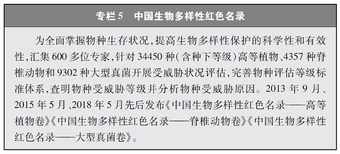 開展全國生物多樣性調查與評估。大力推進生物多樣性保護重大工程實施,結合自然資源調查、生態(tài)系統監(jiān)測評估等工作,不斷完善生物多樣性調查與評估能力,首次將生物多樣性指標納入生態(tài)質量綜合評價指標體系,引導地方加強生態(tài)文明建設與生物多樣性保護。開展自然資源調查,包括森林、草原、水、濕地、荒漠、海洋等,建立自然資源調查評價監(jiān)測制度。構建了涵蓋2376個縣級行政單元、樣線總長超過3.4萬公里的物種分布數據庫,建立物種資源調查及收集信息平臺,準確反映野生動植物空間分布狀況。完成長江經濟帶、京津冀等國家戰(zhàn)略區(qū)域180多個縣級行政區(qū)生物多樣性調查與評估。組織開展近海漁業(yè)資源調查,初步掌握近海漁業(yè)資源狀況。陸續(xù)發(fā)布《中國植物紅皮書》《中國瀕危動物紅皮書》《中國物種紅色名錄》《中國生物多樣性紅色名錄》,基本掌握生物多樣性總體情況,為加強生物多樣性保護奠定了科學基礎。