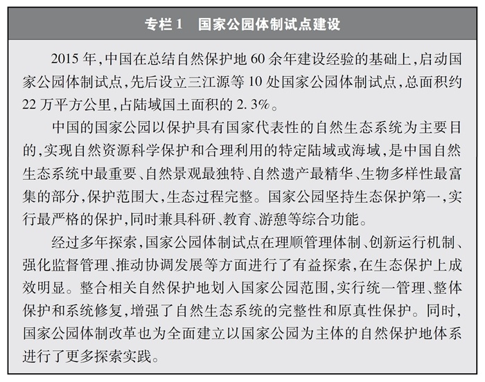中國不斷推進自然保護地建設,啟動國家公園體制試點,構建以國家公園為主體的自然保護地體系,率先在國際上提出和實施生態(tài)保護紅線制度,明確了生物多樣性保護優(yōu)先區(qū)域,保護了重要自然生態(tài)系統和生物資源,在維護重要物種棲息地方面發(fā)揮了積極作用。
