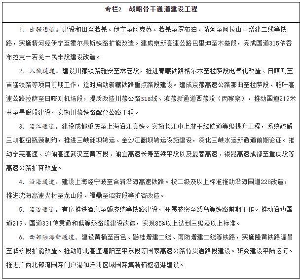 加強戰(zhàn)略骨干通道建設(shè)。推進(jìn)出疆入藏通道建設(shè),擴大甘新、青新、青藏、川藏四條內(nèi)聯(lián)主通道通行能力,穩(wěn)步推進(jìn)川藏鐵路建設(shè),加快推進(jìn)新藏鐵路和田至日喀則段前期工作、適時啟動重點路段建設(shè),有序推進(jìn)滇藏鐵路前期工作,密實優(yōu)化航空航線網(wǎng)絡(luò)布局,構(gòu)建多向聯(lián)通的通道布局。暢通沿江通道,加快建設(shè)沿江高鐵,優(yōu)化以高等級航道和干線鐵路、高速公路為骨干的沿江綜合運輸大通道功能。升級沿海通道,提高鐵路通道能力,推進(jìn)高速公路繁忙路段擴容改造,提升港口航道整體效能,構(gòu)建大容量、高品質(zhì)的運輸走廊。貫通沿邊通道,提級改造普通國省干線,推進(jìn)重點方向沿邊鐵路建設(shè),提高安全保障水平。建設(shè)西部陸海新通道,發(fā)揮鐵路在陸路運輸中的骨干作用和港口在海上運輸中的門戶作用,強化東、中、西三條通路,形成大能力主通道,銜接國際運輸通道。