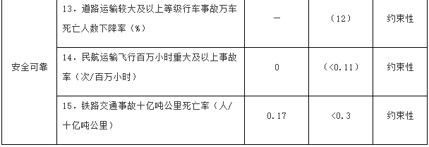 注:①〔〕內(nèi)為5年累計數(shù)。②指納入國家批準(zhǔn)的城市軌道交通建設(shè)規(guī)劃中的大中運量城市軌道交通項目。③指國際樞紐機場和區(qū)域樞紐機場中連通軌道交通的機場數(shù)量占比。④指重點營運車輛、郵政快遞自有干線運輸車輛、應(yīng)安裝具備衛(wèi)星定位功能船載設(shè)備的客船及危險品船等。⑤指新能源公交車輛占所有地面公交車輛的比重。⑥指按單位運輸周轉(zhuǎn)量計算的二氧化碳排放。
