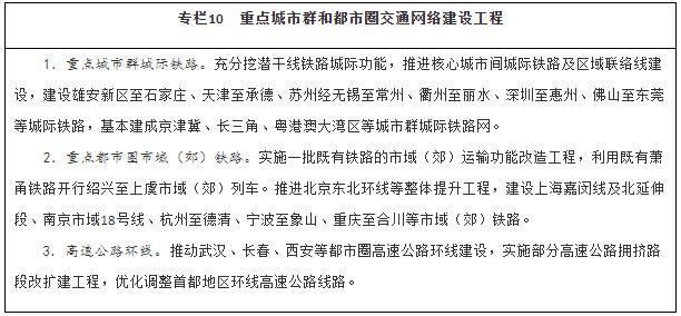 強化重點城市群城際交通建設(shè)。圍繞京津冀、長三角、粵港澳大灣區(qū)、成渝、長江中游等城市群,以軌道交通、高速公路為骨干,提升城際運輸通道功能,加強核心城市快速直連,構(gòu)建多節(jié)點、網(wǎng)絡(luò)化的城際交通網(wǎng),實現(xiàn)城市群內(nèi)主要城市間2小時通達(dá)。整體推進(jìn)京津冀、長三角、粵港澳大灣區(qū)城際鐵路和市域(郊)鐵路建設(shè),有序推動成渝地區(qū)雙城經(jīng)濟圈城際鐵路和市域(郊)鐵路建設(shè),加強與高速鐵路、普速鐵路一體銜接,擴大對5萬人口以上城鎮(zhèn)的有效覆蓋。