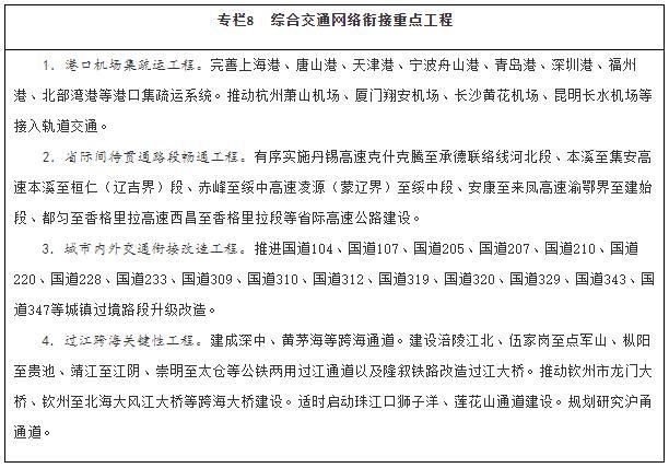 加快解決制約人民美好出行、貨物高效流通的瓶頸,強化綜合交通網(wǎng)絡(luò)有機銜接。打通公路省際待貫通路段,加強干線公路與城市道路有效銜接,推進(jìn)城鎮(zhèn)密集地區(qū)干線公路過境段、進(jìn)出城瓶頸路段升級改造。加強樞紐機場與軌道交通高效銜接,使換乘更加便捷。強化進(jìn)港區(qū)、進(jìn)園區(qū)、進(jìn)廠區(qū)、進(jìn)規(guī)模化農(nóng)產(chǎn)品基地等集疏運設(shè)施建設(shè),加快推動鐵路進(jìn)港口重點港區(qū)和大型工礦企業(yè)、物流園區(qū)、重點物資儲備庫。統(tǒng)籌考慮資源高效利用、生態(tài)環(huán)境保護和防洪航運安全,有序建設(shè)各種運輸方式共享通道資源的過江跨海通道。推動超大特大城市的大型綜合客運樞紐間通過軌道交通互連。加快實現(xiàn)聯(lián)系緊密的綜合貨運樞紐間通過聯(lián)絡(luò)線或?qū)S猛ǖ阑ミB。