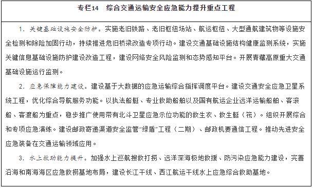 健全綜合交通運輸應(yīng)急管理體制機制,完善應(yīng)急協(xié)調(diào)機制和應(yīng)急預(yù)案體系,加強交通運輸調(diào)度與應(yīng)急指揮平臺建設(shè)。推進(jìn)區(qū)域性公路應(yīng)急裝備物資儲備中心建設(shè)。加強水上交通安全監(jiān)管、航海保障和救助打撈能力建設(shè),完善沿海和內(nèi)河溢油應(yīng)急設(shè)備庫,構(gòu)建陸海空天一體化水上交通運輸安全保障體系。建設(shè)城市軌道交通應(yīng)急演練中心。以骨干航空物流企業(yè)為主體構(gòu)建航空應(yīng)急服務(wù)網(wǎng)絡(luò)。建設(shè)海事監(jiān)管指揮系統(tǒng)。在開展城市交通基礎(chǔ)設(shè)施地下空間、低洼區(qū)域、重點區(qū)段、重要點位、關(guān)鍵設(shè)施等隱患排查基礎(chǔ)上,建立健全風(fēng)險臺賬和災(zāi)害隱患清單,補齊設(shè)施設(shè)備、應(yīng)急搶險物資等短板,持續(xù)完善應(yīng)急處置預(yù)案,健全應(yīng)急響應(yīng)機制,提升應(yīng)對極端天氣能力。加強應(yīng)急專業(yè)隊伍和志愿者隊伍建設(shè),充實國家應(yīng)急運輸儲備力量。健全應(yīng)對重大疫情、防范應(yīng)對恐怖襲擊、保障信息安全等非傳統(tǒng)安全應(yīng)急指揮體系和應(yīng)急交通組織。
