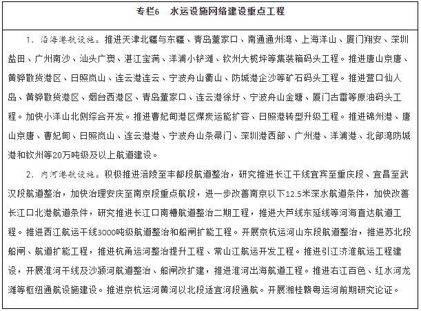 優(yōu)化暢通水運設(shè)施網(wǎng)絡(luò)。建設(shè)京津冀、長三角、粵港澳大灣區(qū)世界級港口群,支持山東打造世界一流的海洋港口,推進(jìn)東北地區(qū)沿海港口一體化發(fā)展,優(yōu)化港口功能布局,推動資源整合和共享共用。有序推進(jìn)沿海港口專業(yè)化碼頭及進(jìn)出港航道等公共設(shè)施建設(shè)。適度超前建設(shè)糧食、能源、礦產(chǎn)資源的接卸、儲存、中轉(zhuǎn)設(shè)施,推進(jìn)沿海沿江液化天然氣碼頭規(guī)劃建設(shè)。提升內(nèi)河港口專業(yè)化、規(guī)模化水平,合理集中布局集裝箱、煤炭、鐵礦石、商品汽車等專業(yè)化碼頭。加強內(nèi)河高等級航道擴能升級與暢通攻堅建設(shè),完善長江、珠江、京杭運河和淮河等水系內(nèi)河高等級航道網(wǎng)絡(luò),進(jìn)一步提升珠三角高等級航道網(wǎng)出海能力,全面加強長三角、珠江—西江高等級航道網(wǎng)未達(dá)標(biāo)段建設(shè)。推動重要支流航道和庫湖區(qū)航道、內(nèi)河旅游航道、便民碼頭建設(shè)。